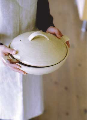 小さな持ち手が持ち手が反り返っていて持ちやすく、すっきりとした形の2~3人用の土鍋です。